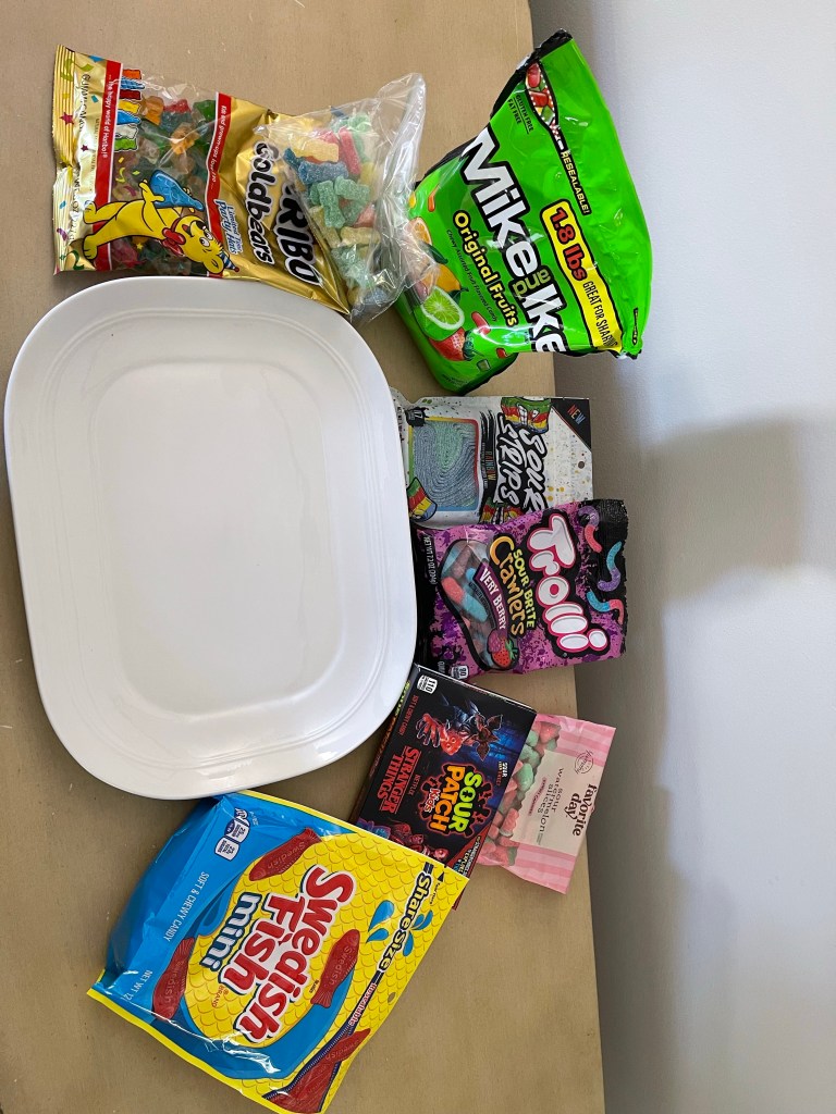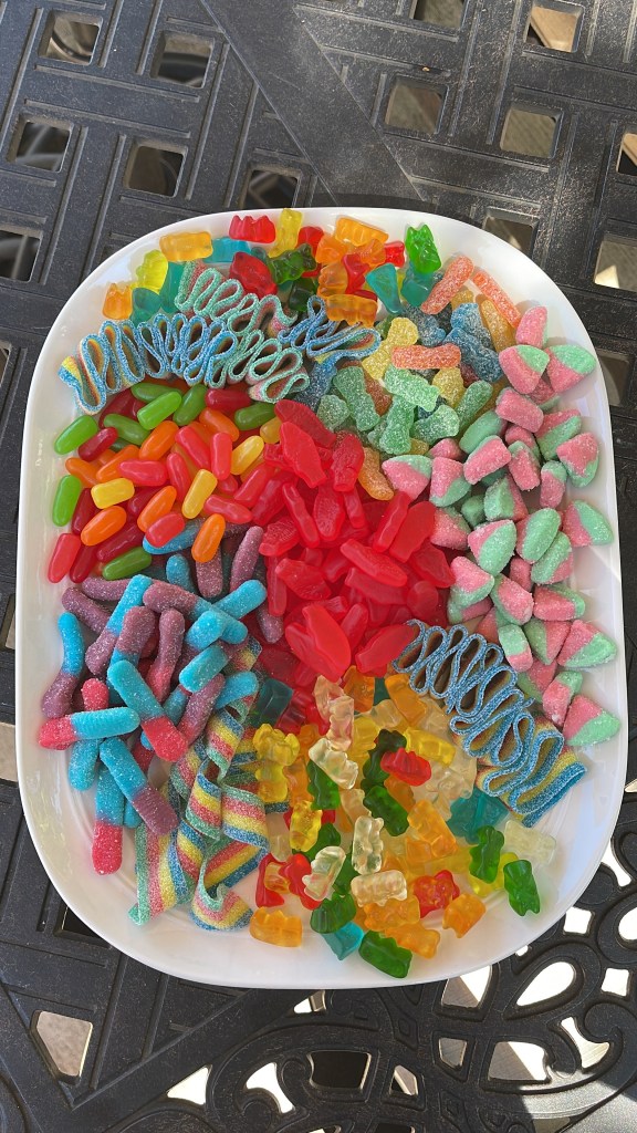 The key to charcuterie is to group together, making piles or fun shapes. I went the east way and did ribbons and piles for the Candy.