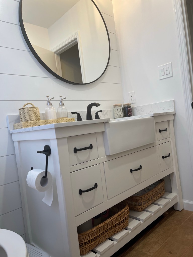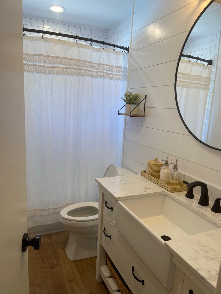 I told my husband if we were going to remodel this bathroom, I want to make sure that it’s a long lasting style. So then we researched. My goals were a farmhouse look, yet modern and clean. We went with white, brown color theme.