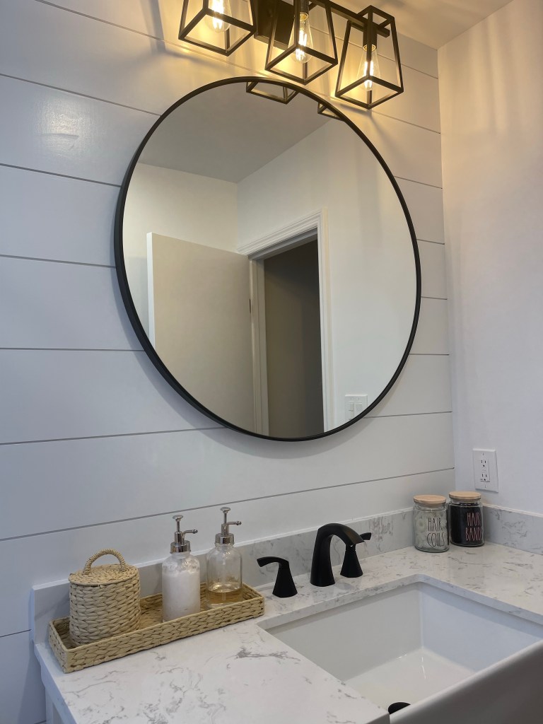 A hugeeeee turnaround! I am so very happy with our results. I purchased mostly from Lowes and Target. The round mirror was actually cheap and from Amazon! This remodeling took about one month to complete.
